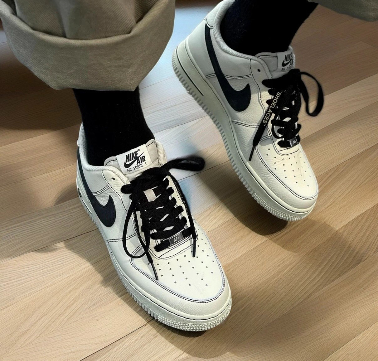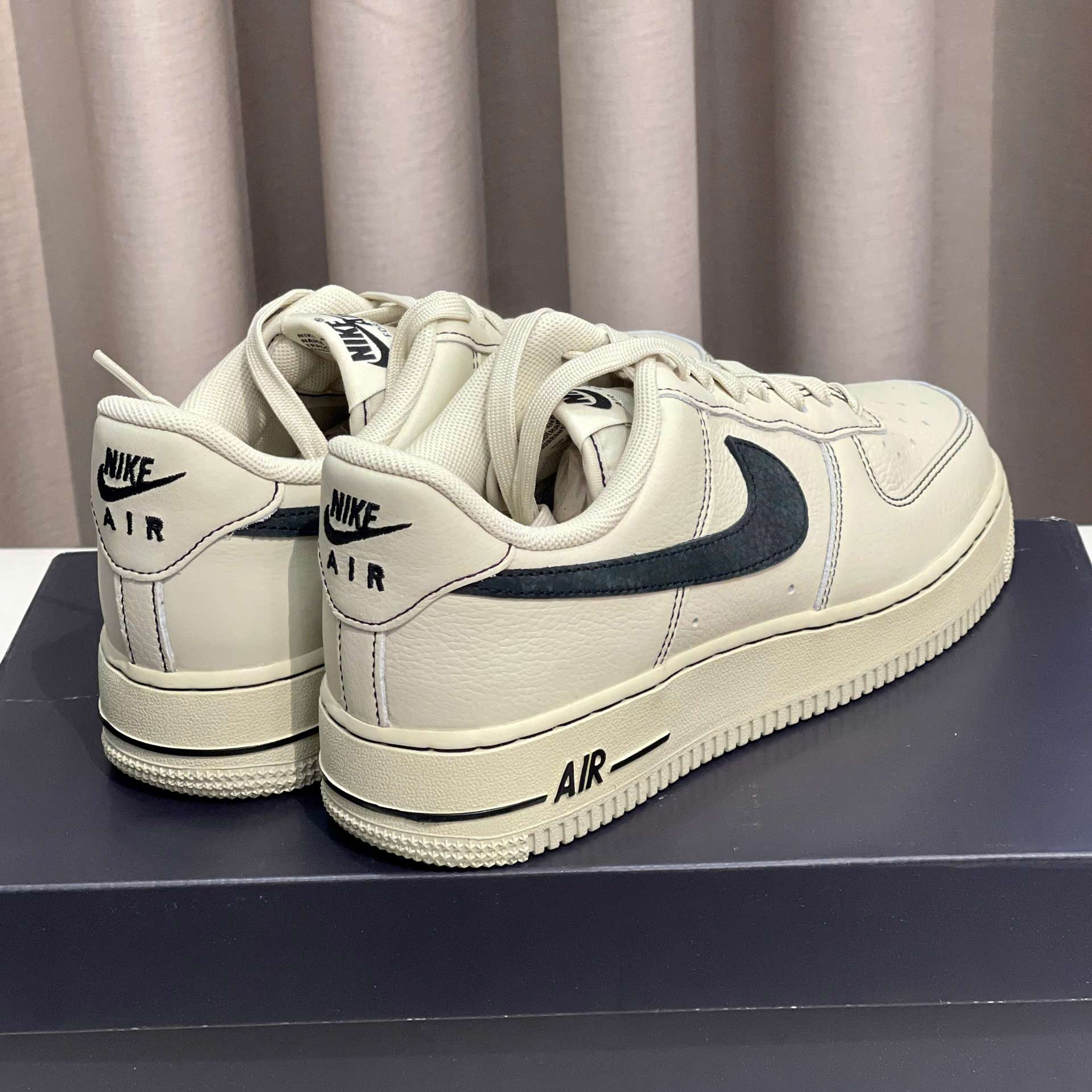 Sử dụng shoe tree hoặc nhét giấy vào bên trong Giày Nike Air Force 1 '07 LV8 Light Khaki Black HQ2037-200 để giữ hình dáng ban đầu.