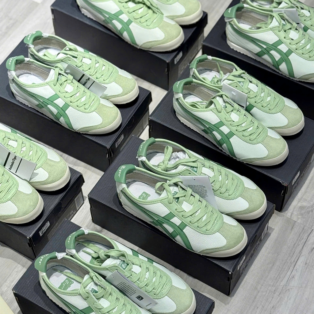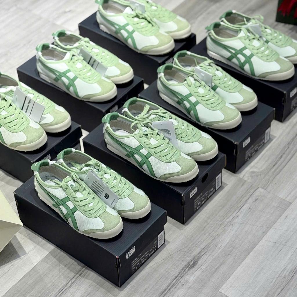 Dòng Mexico 66 từ lâu đã là "linh hồn" của thương hiệu Onitsuka Tiger. Tuy nhiên, với mã màu Airy Green (Xanh bạc hà) kết hợp cùng các đường sọc trắng đặc trưng, phiên bản 1183A201-304 mang đến một vẻ ngoài thanh thoát, trẻ trung hơn hẳn các phối màu truyền thống như White/Blue/Red.